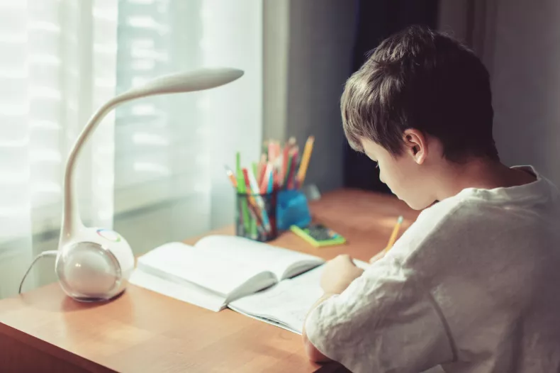 Рабочее место должно быть хорошо освещено. Это поможет, с одной стороны, сохранить зрение, а с другой — предотвратить искривление осанки, так как ребенку не придется низко наклоняться, чтобы разобрать текст в тетради или книге. Для этого и в комнате в целом, и на рабочем столе в частности должны использоваться приборы с достаточно мощным освещением, а в идеале — с возможностью регулировать его интенсивность. Необходимо свести к минимуму вероятность возникновения бликов и избавиться от мерцающего света. Также считается, что холодный свет помогает концентрироваться, в то время как теплый способствует расслаблению. Поэтому для освещения рабочего места лучше выбирать лампочки с холодным светом, но в первую очередь лучше ориентироваться на ощущения самого ребенка.