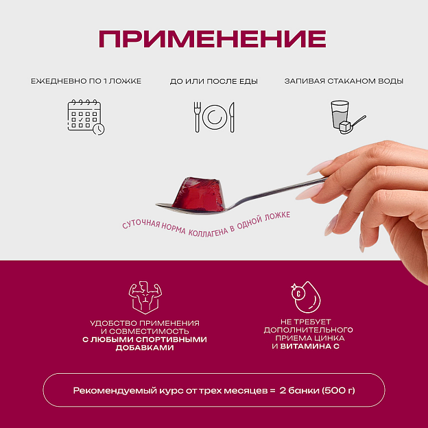 • Не требует и не содержит витамина С: высокая усвояемость за счет содержания аминокислот оксипролина и оксилизина, которые в том числе запускают синтез собственного коллагена.