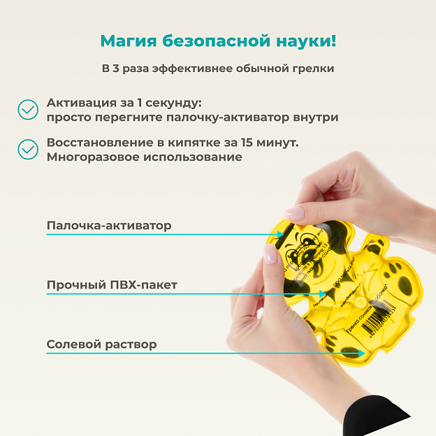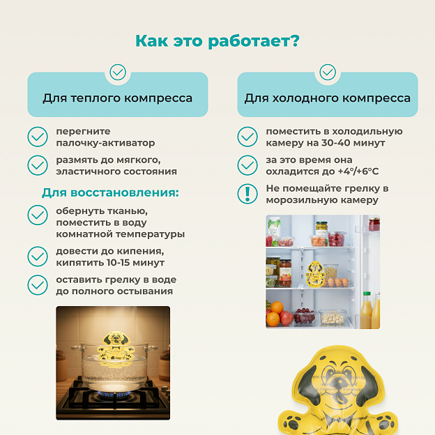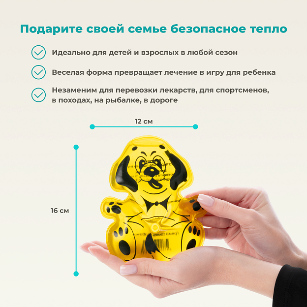 Дельта-Терм «Собачка» — это детская многоразовая солевая грелка, созданная для безопасного прогревания и снятия боли у малышей. Устройство в виде забавного щенка генерирует тепло через процесс кристаллизации ацетата натрия, находящегося в прочной и мягкой оболочке из гипоаллергенного ПВХ. При активации гибкой палочки-пускателя грелка моментально нагревается до комфортной температуры +52°C, сохраняя тепло до 1 часа. После использования восстанавливается кипячением и может применяться повторно до 1000 циклов. В охлажденном состоянии работает как нежный холодный компресс.