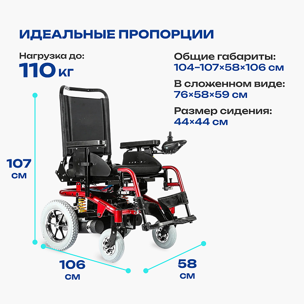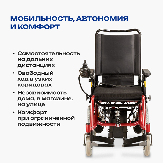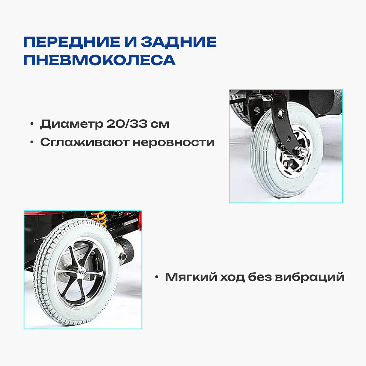 Общая ширина коляски (всего 58 см) позволяет человеку без труда проезжать в узких коридорах. Передние и задние пневматические колеса обеспечивают мягкое, гладкое скольжение на неровных поверхностях.