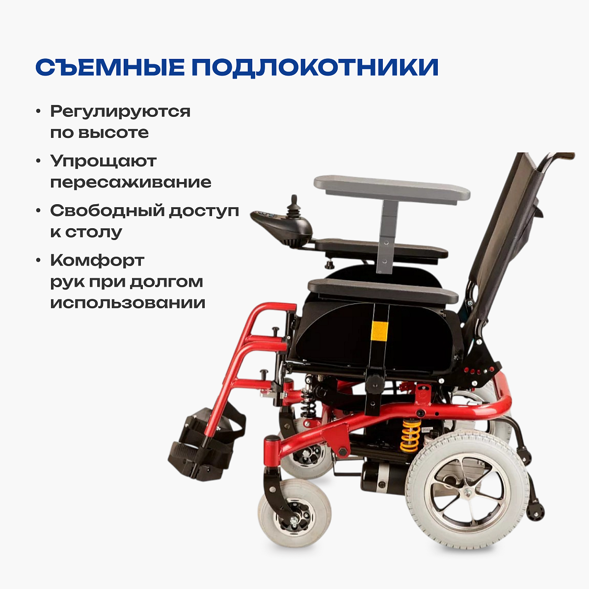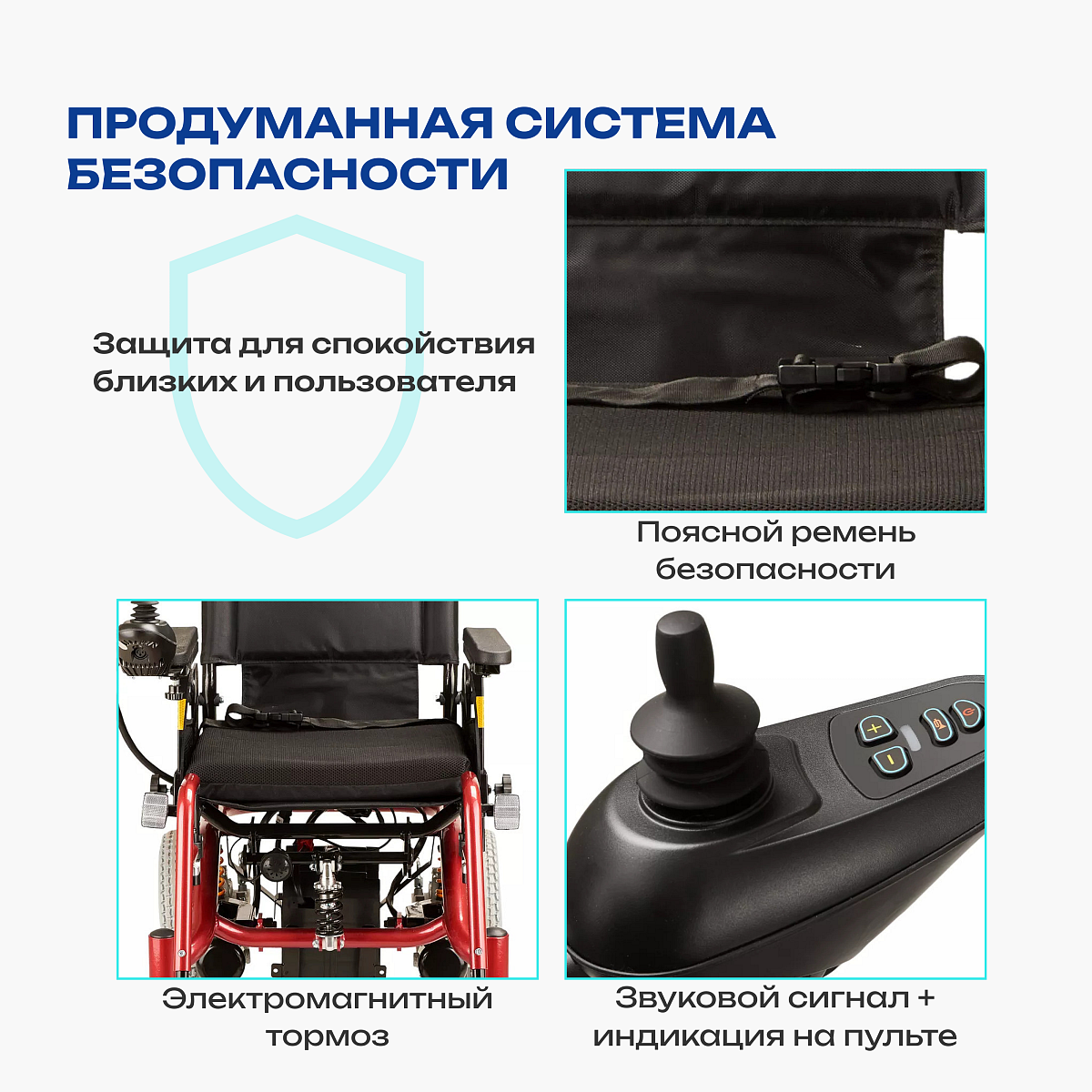 Два съемных роликовых антиопрокидывателя не позволят коляске завалиться на уклонах и пандусах. Звуковой сигнал привлечет людей, если вдруг ему понадобится помощь. Автоматический электромагнитный тормоз обеспечит устойчивость во время остановки.