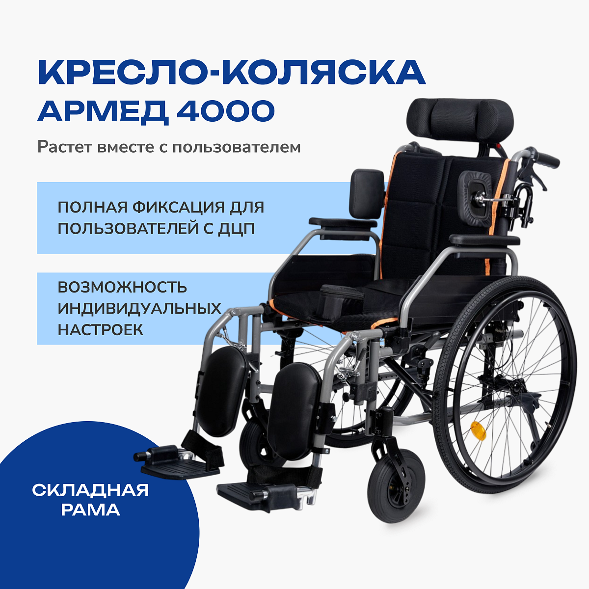 Кресло-коляска Armed 4000 — выбор для тех, кому нужна не просто коляска, а удобное и безопасное средстве передвижения на каждый день. Модель подходит для дома, улицы, прогулок и реабилитации людей с выраженными нарушениями опоры и контроля тела, в том числе с ДЦП. Регулируемые элементы обеспечивают комфортную и стабильную посадку даже при серьезных нарушениях моторики.