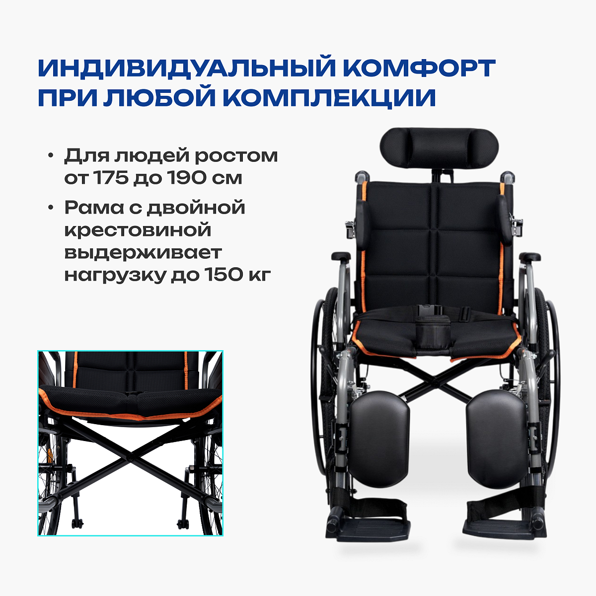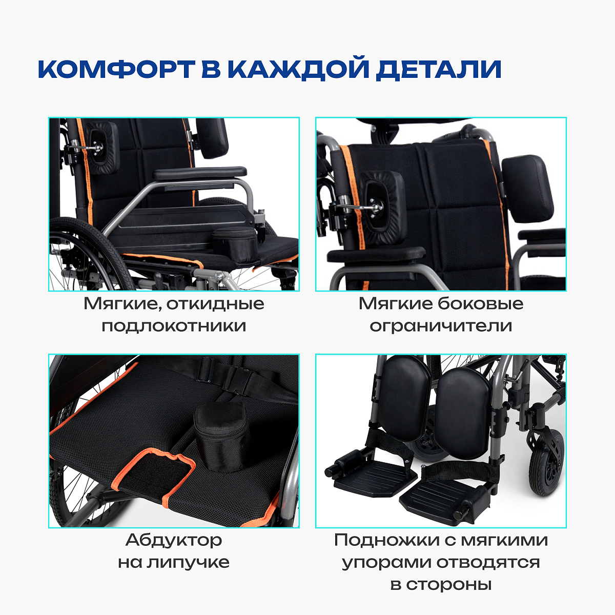 • набор элементов поддержки (абдуктор, подголовник, боковые фиксаторы, мягкие опоры под голени, поясной ремень) делает модель удобной для пользователей с ДЦП;