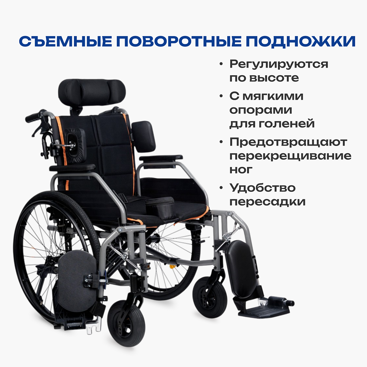 • съемные поворотные подножки, регулируемые по длине, с мягкими опорами для голеней;