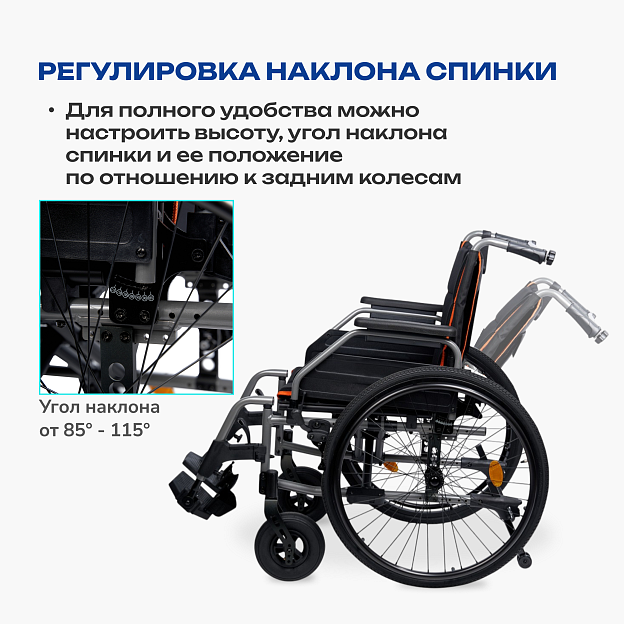 • настройка колесной базы: изменение высоты сиденья от пола и положения колес по отношению к спинке для удобного самостоятельного хода;