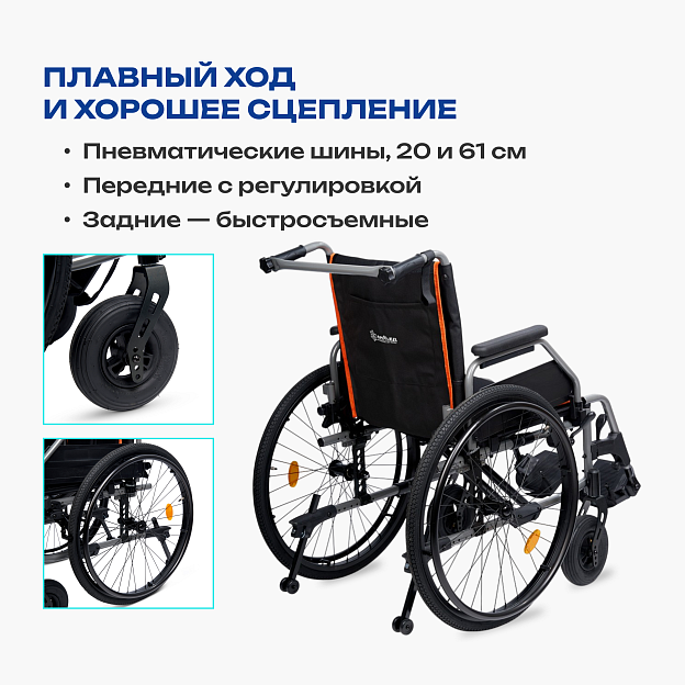 • задние колеса быстросъемные, передние — маневренные, что облегчает управление и транспортировку;