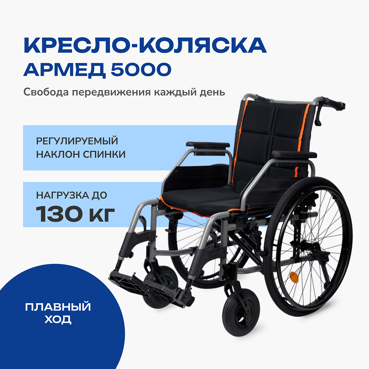 Кресло-коляска Armed 5000 создано специально для тех, кто ежедневно нуждается в надежной опоре при передвижении: пожилых людей, маломобильных пользователей и пациентов в период восстановления после травм и операций. Усиленная рама с двойной крестовиной и складной конструкцией быстро уменьшается в габаритах для хранения и перевозки. Модель выдерживает нагрузку до 130 кг. Гибкая регулировка спинки (6 фиксируемых положений), сиденья, подлокотников и подножек позволяет «подогнать» кресло под конкретного человека, делая его удобным для многочасового использования в течение дня.