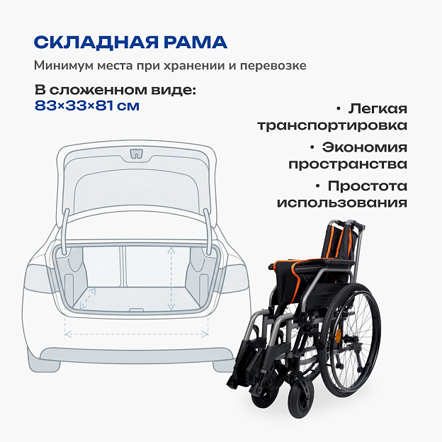 • быстросъемные задние колеса и небольшой размер в сложенном виде упрощают погрузку в автомобиль и хранение в квартире;