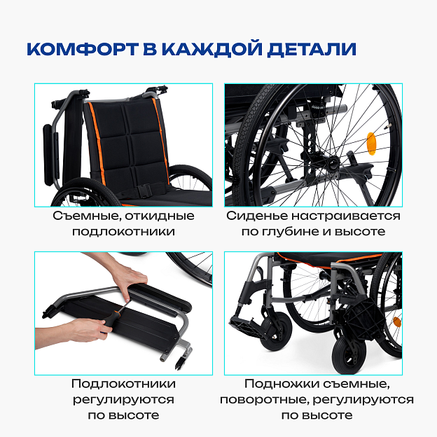 • возможность тонкой настройки спинки, сиденья, подлокотников и подножек помогает настроить коляску под рост, вес и особенности пользователя;