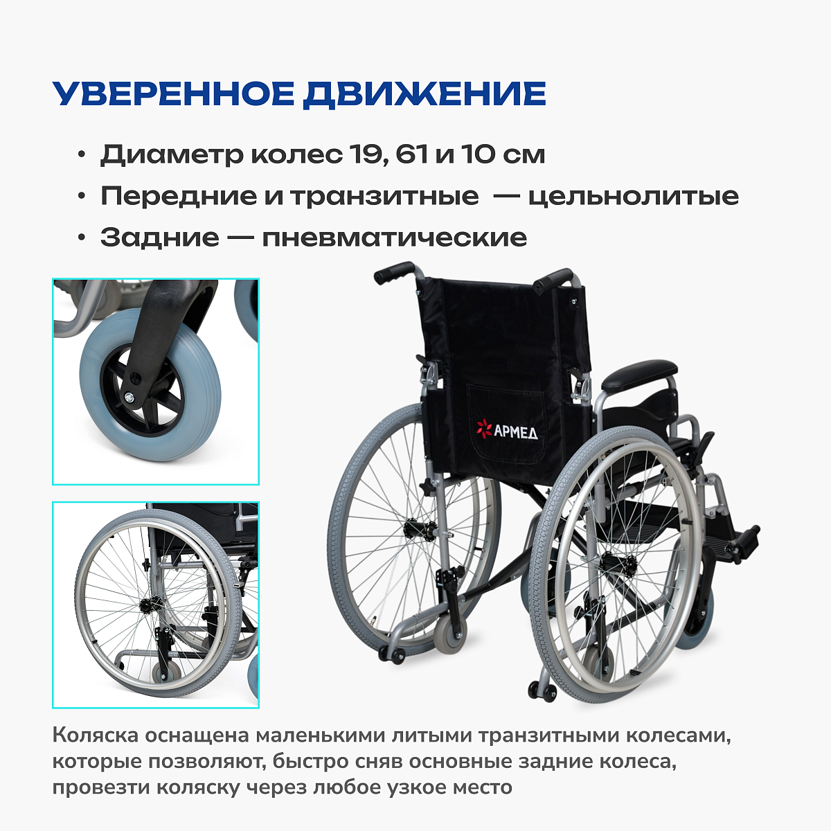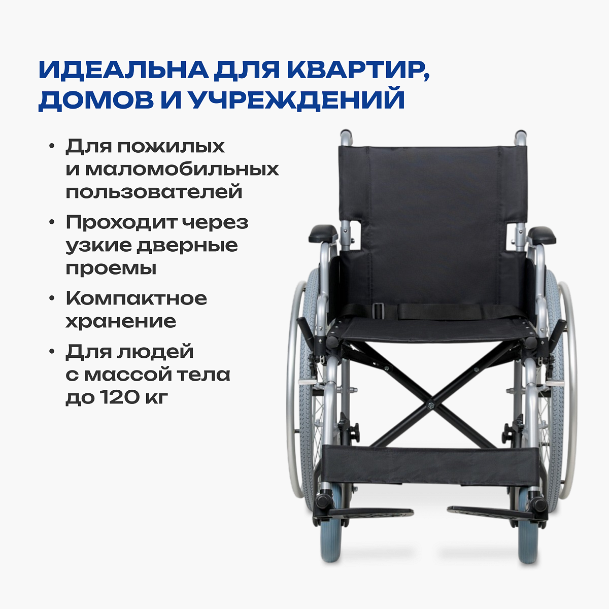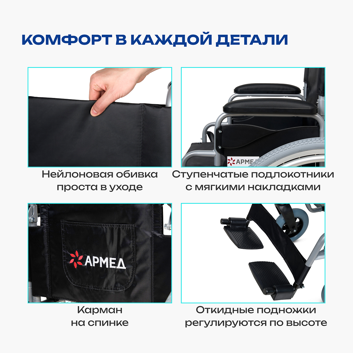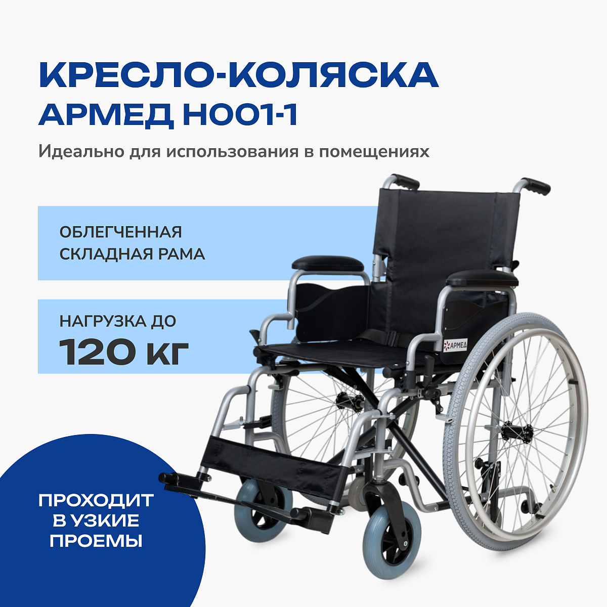 Кресло-коляска для инвалидов АРМЕД H001-1 — универсальное решение для комфортного передвижения в домашних условиях и преодоления узких проемов. Облегченная алюминиевая рама с быстросъемными и транзитными колесами позволяет легко маневрировать в квартирах, лифтах и транспорте. Съемные подлокотники, откидные подножки и регулируемые антиопрокидыватели обеспечивают безопасность и удобство посадки даже в ограниченном пространстве.