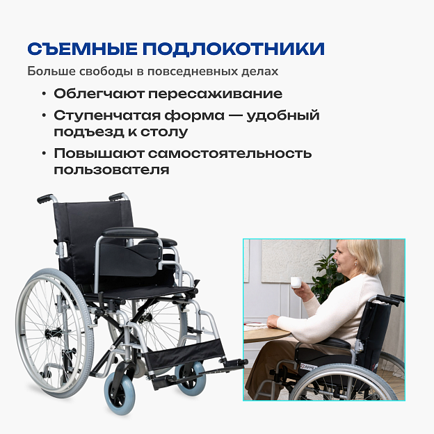 • съемные ступенчатые подлокотники с мягкими вставками дают доступ к столу и упрощают пересадку;