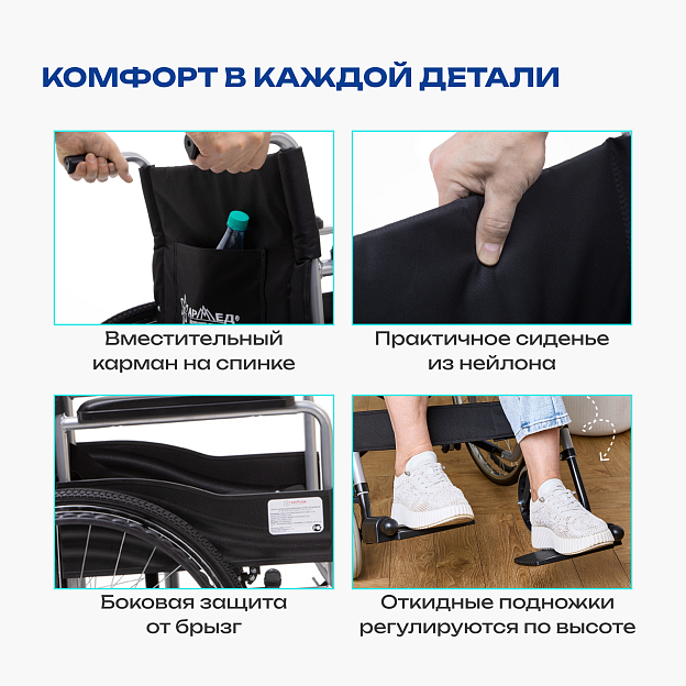 • регулировка высоты подножек и откидные опоры для стоп, которые можно поднимать для облегчения пересаживания;