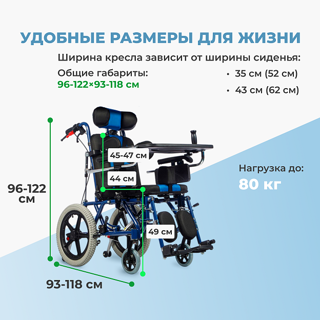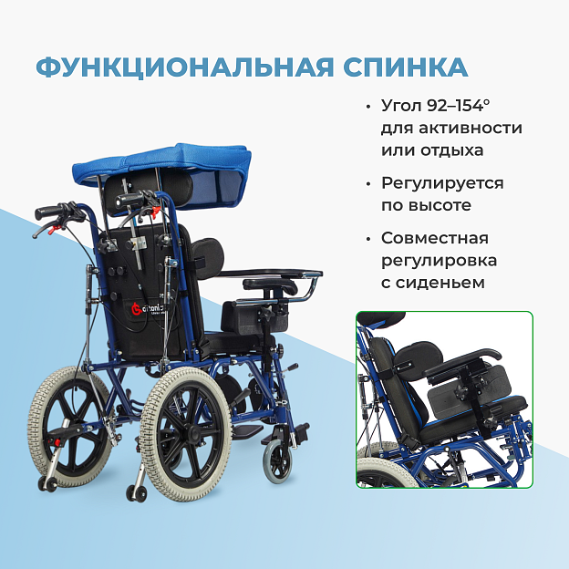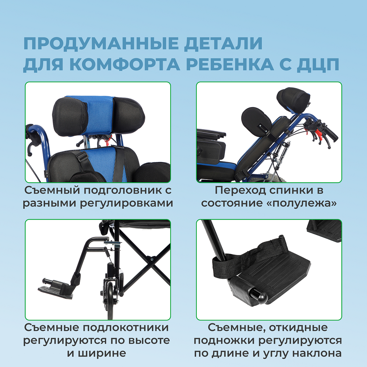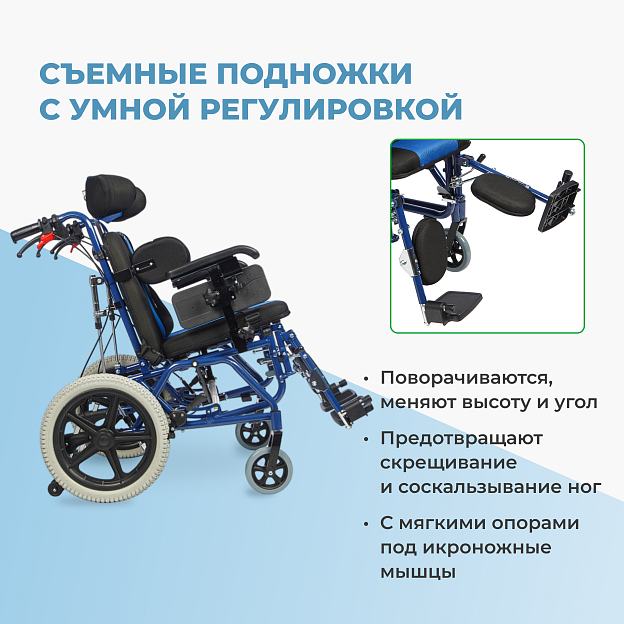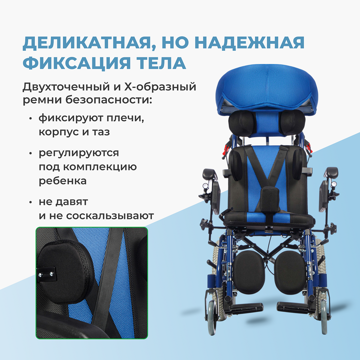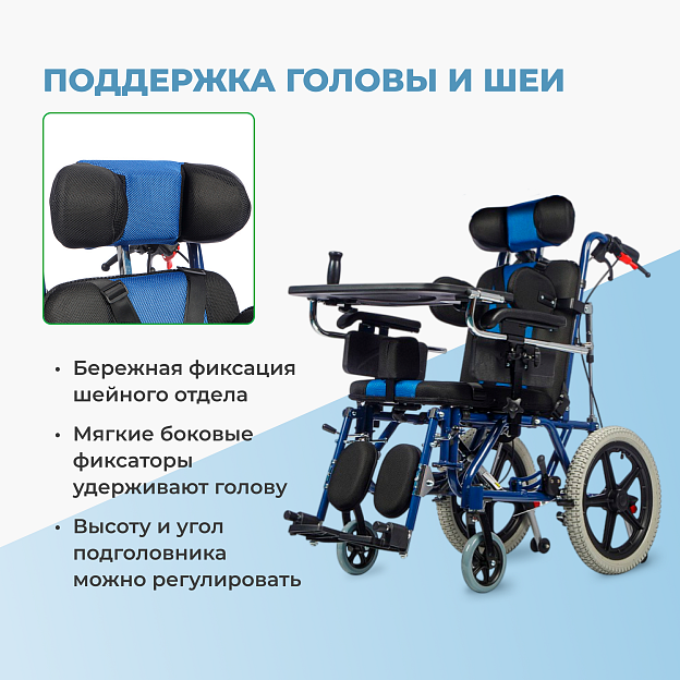 • Полное оснащение для детей с ДЦП — абдуктор, боковые поддержки, подголовник, ремни — обеспечивает правильное позиционирование и снижает спастичность;