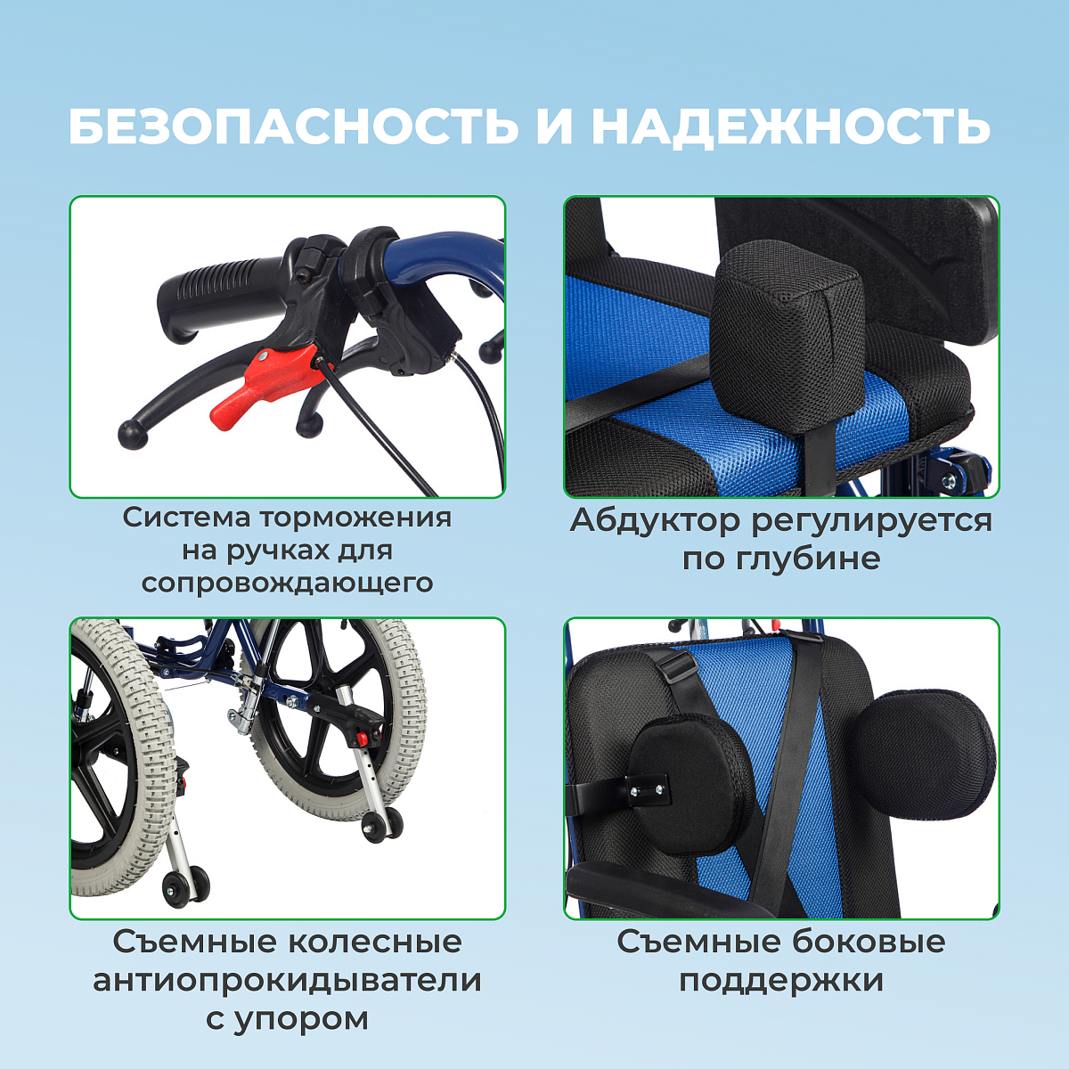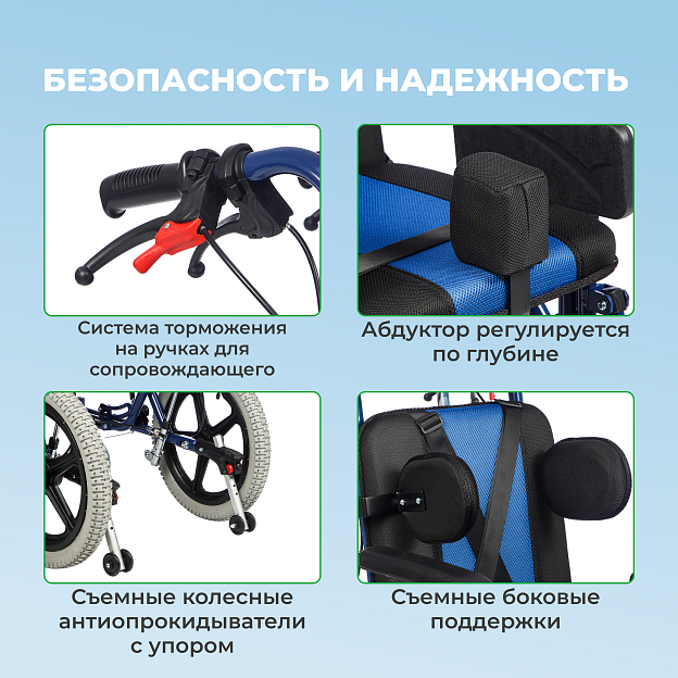 • съемные колесные антиопрокидыватели с упором для сопровождающего;