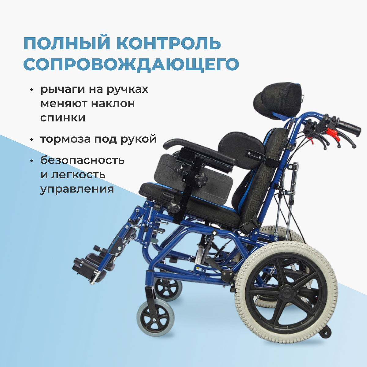 • рычаги на ручках сопровождающего позволяют плавно менять наклон спинки/сиденья и притормаживать без полной остановки;