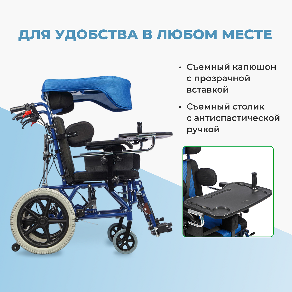 • съемный столик с антиспастической ручкой;