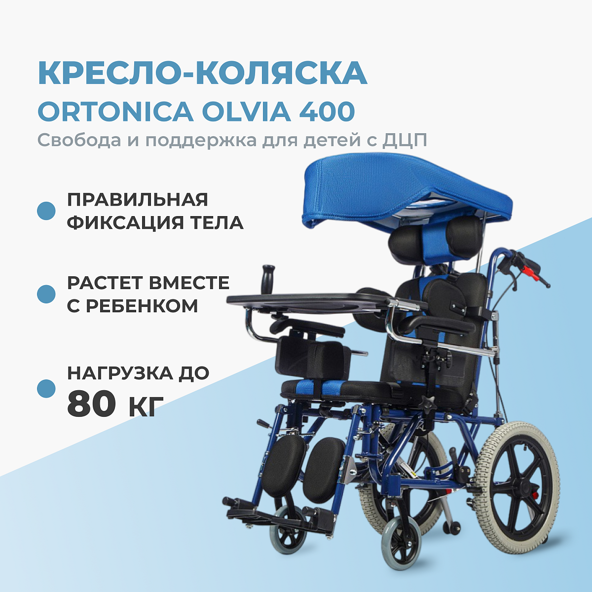 Кресло-коляска Ortonica Olvia 400 — специализированная модель для детей с ДЦП и других двигательными нарушениями, управляемая сопровождающим. Это «растущая» коляска для ежедневных прогулок и реабилитации, где важно удобство родителей и комфорт ребенка.