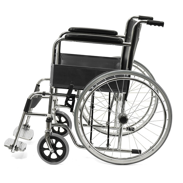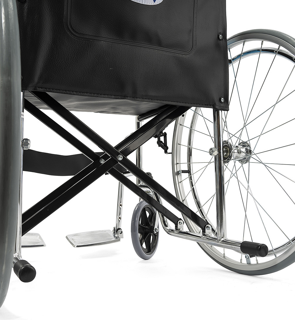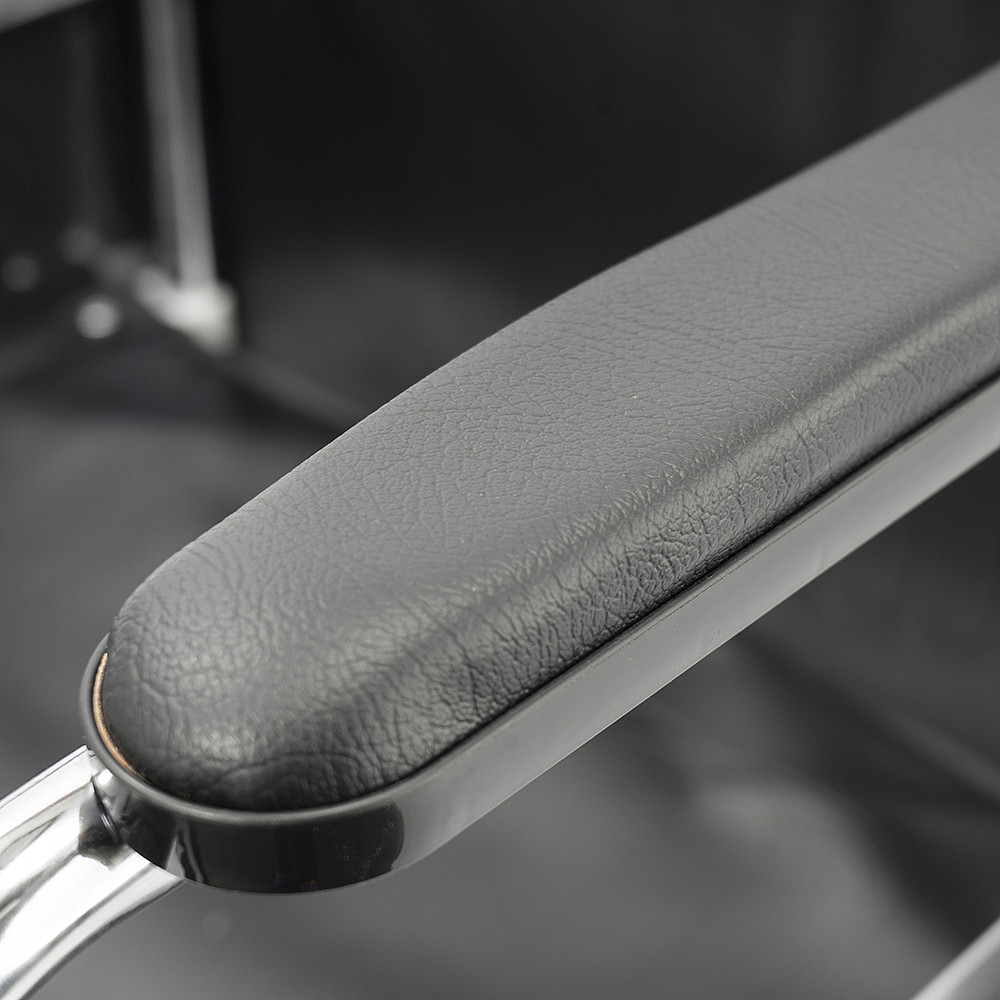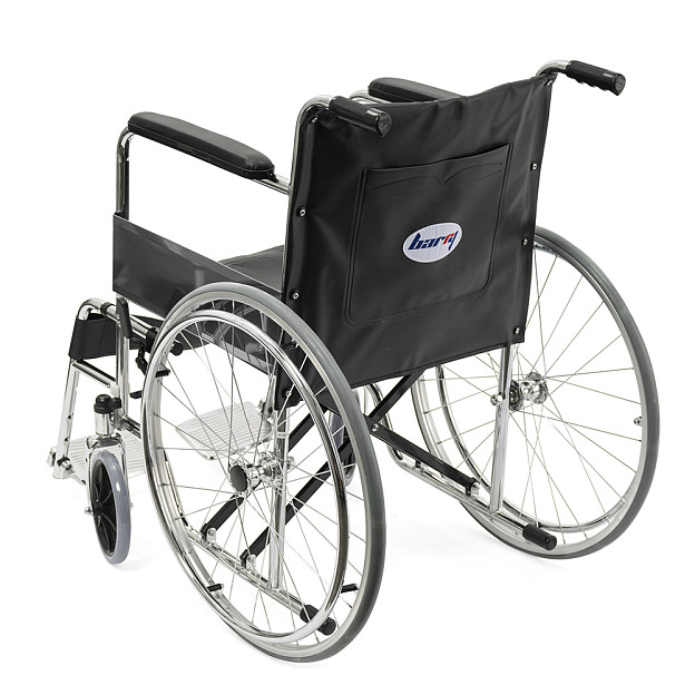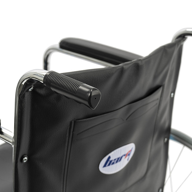 Складная стальная коляска Barry A1 с фиксированными спинкой, подлокотниками и подножками. Материл обивки — качественная экокожа — надёжный, устойчивый к истиранию и имеющий презентабельный вид.