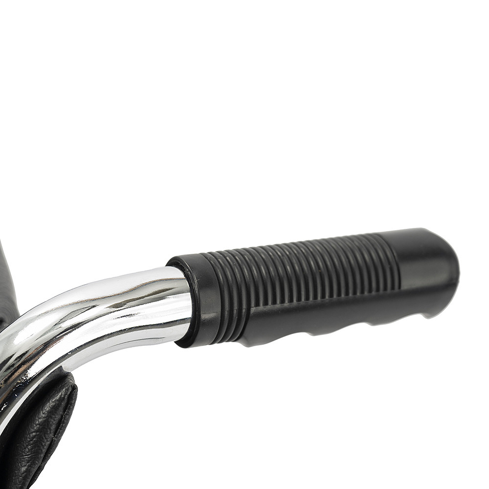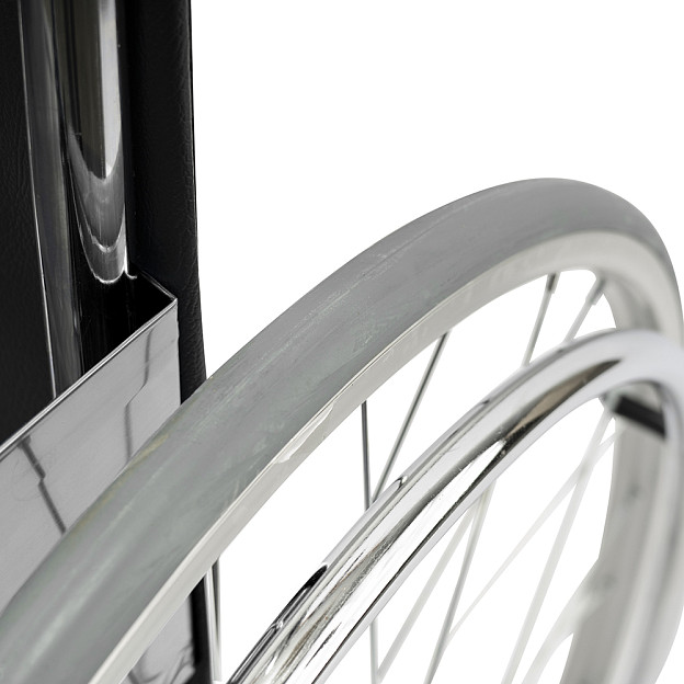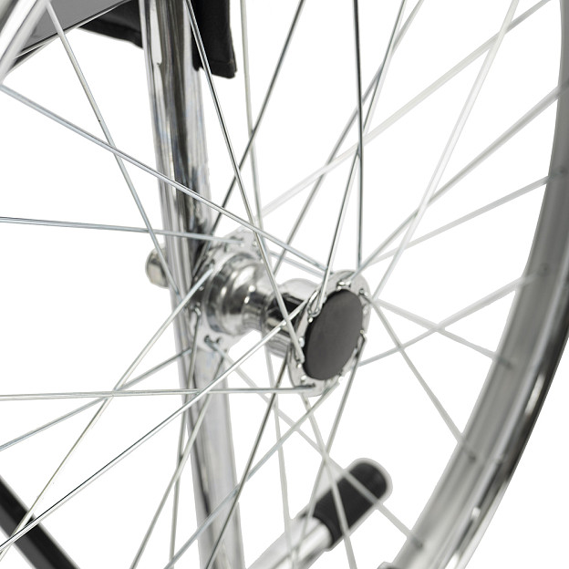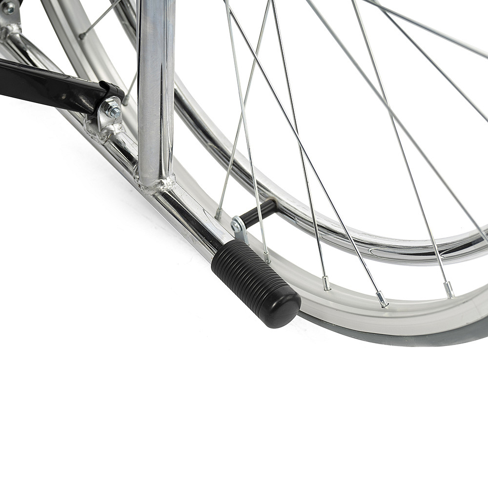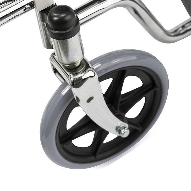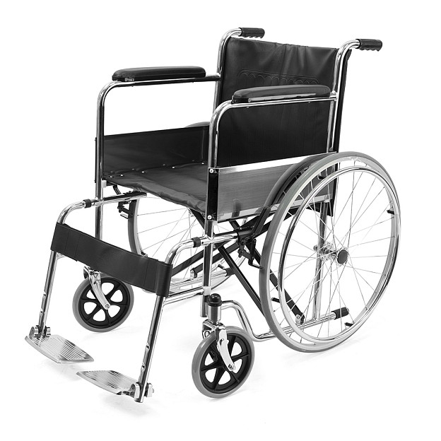 Складная стальная коляска Barry A1 с фиксированными спинкой, подлокотниками и подножками. Материл обивки — качественная экокожа — надёжный, устойчивый к истиранию и имеющий презентабельный вид.