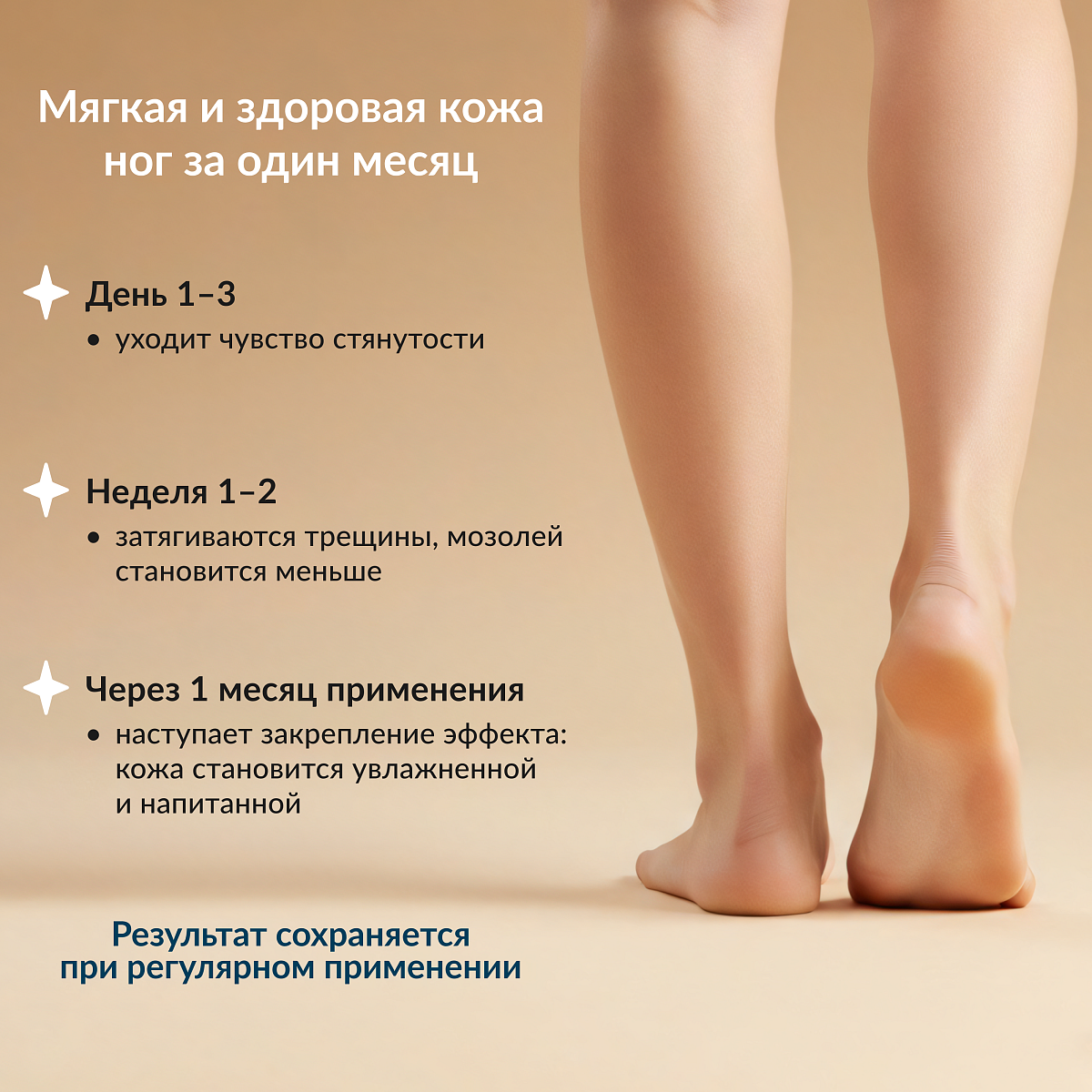 • делает кожу более гладкой, мягкой и эластичной, чтобы пятки и подушечки стоп были приятными на ощупь;