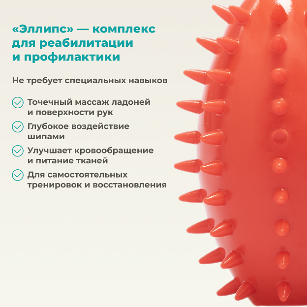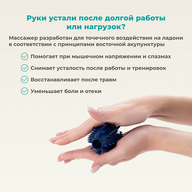 Массажер разработан для точечного воздействия на ладони в соответствии с принципами восточной акупунктуры. Заострённые элементы стимулируют нервные окончания, способствуя улучшению самочувствия, снятию стресса и напряжения, а также повышению общего тонуса организма. Массажёр укрепляет здоровье, успокаивает нервную систему, является гигиеничным и способствует улучшению кровообращения и питания массируемой области.