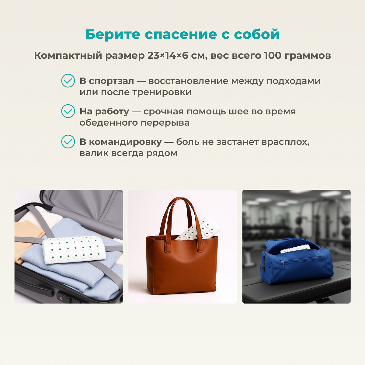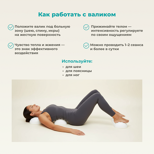 • Расположите валик на любой жесткой поверхности и лягте на него таким образом, чтобы под весом тела обеспечить колющее воздействие в области шеи, грудного отдела или поясницы;