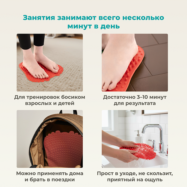 • Массажные шипы разного размера создают эффект чередующейся нагрузки, мягко тренируя мышцы и связки стопы;